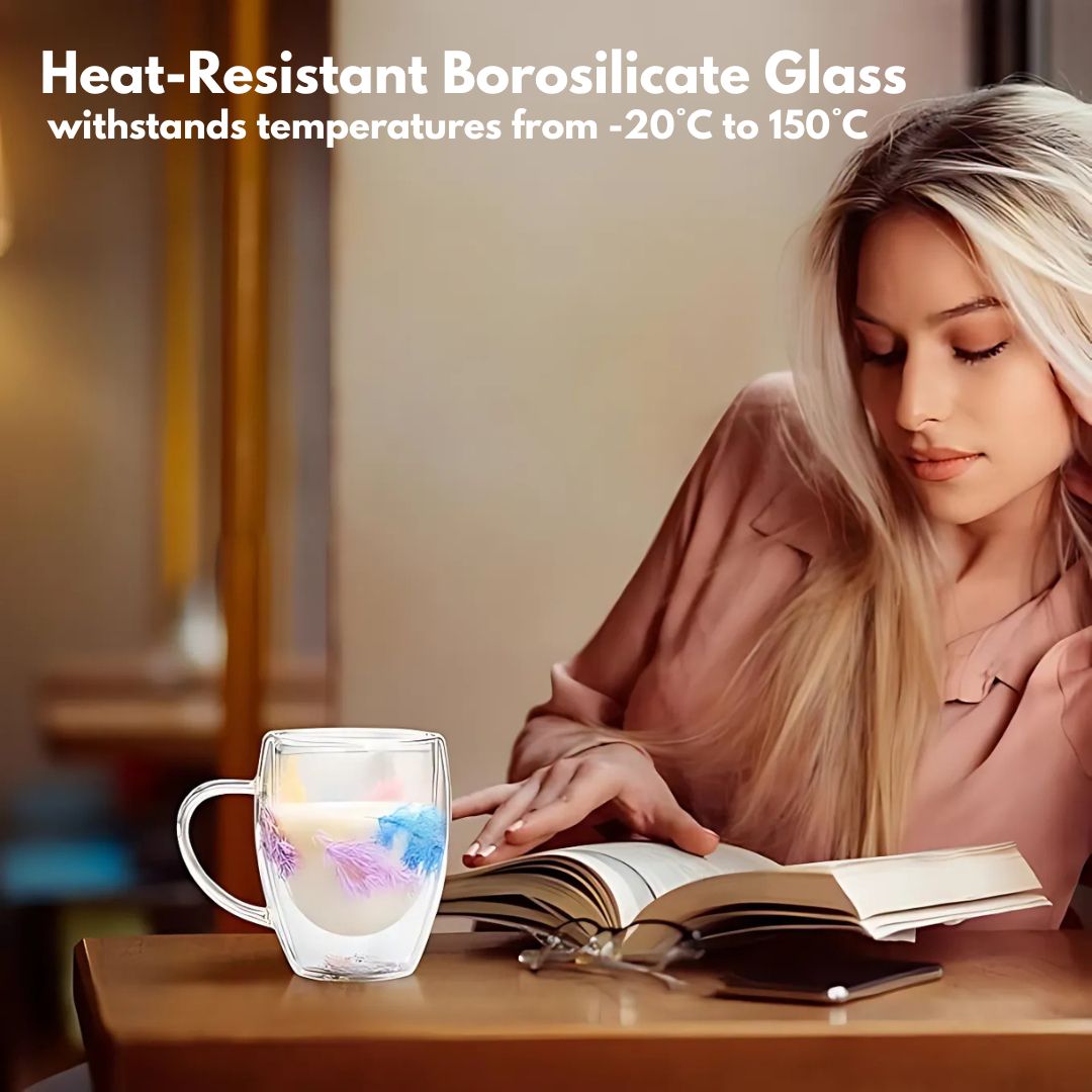 Thanks to its double-layered borosilicate glass design, this mug keeps hot drinks warm and cold drinks cool for longer periods. The insulation helps maintain the perfect temperature of your beverage while preventing condensation on the outside of the glass — no more wet hands or water rings on your table.
