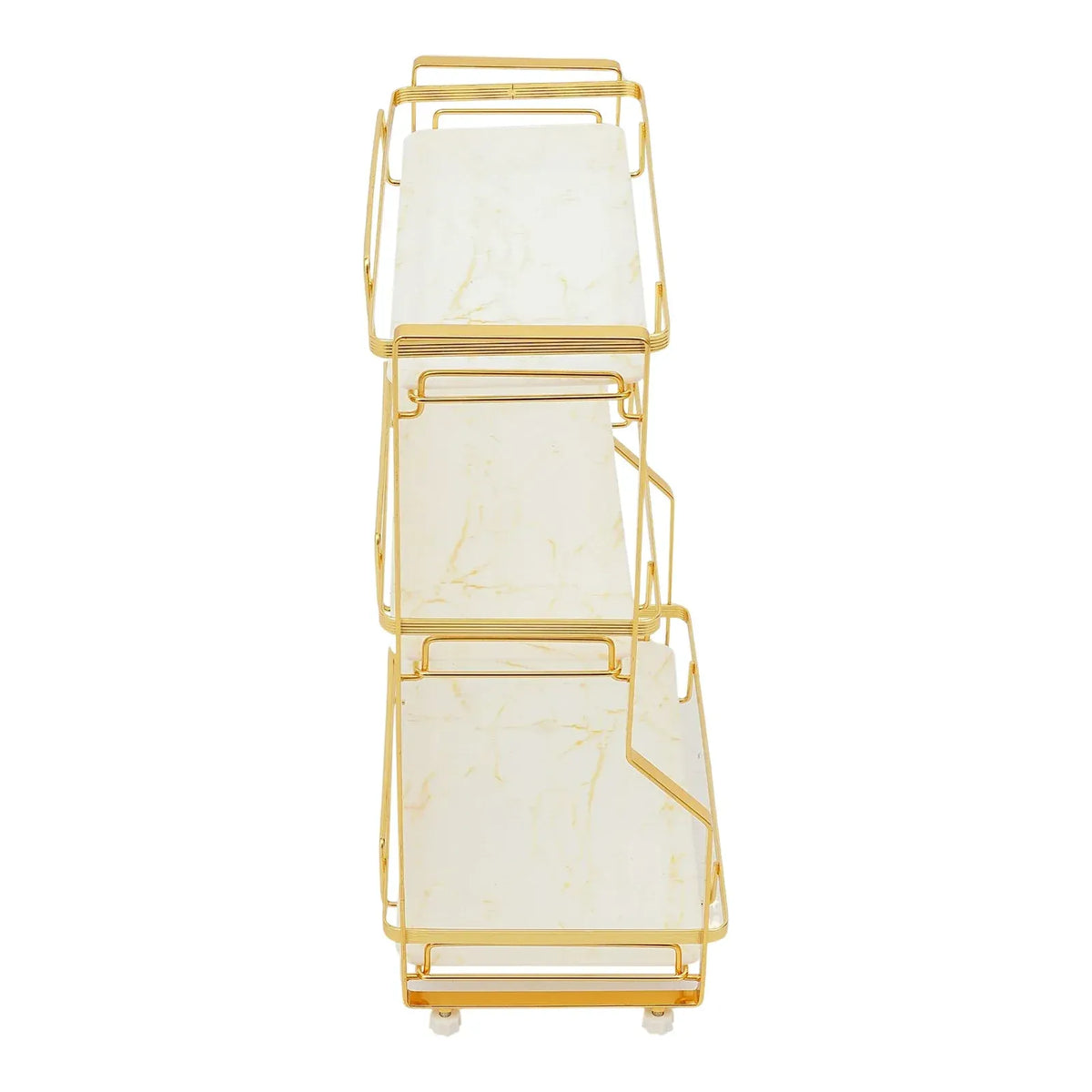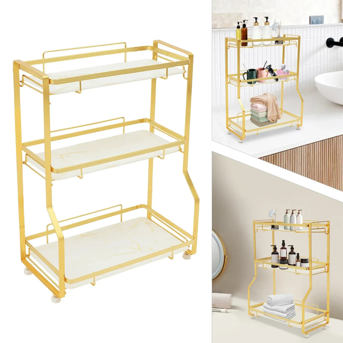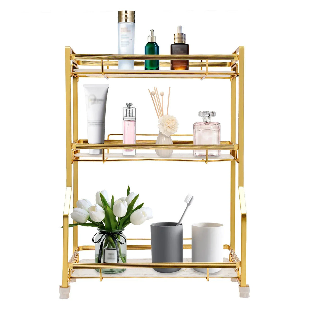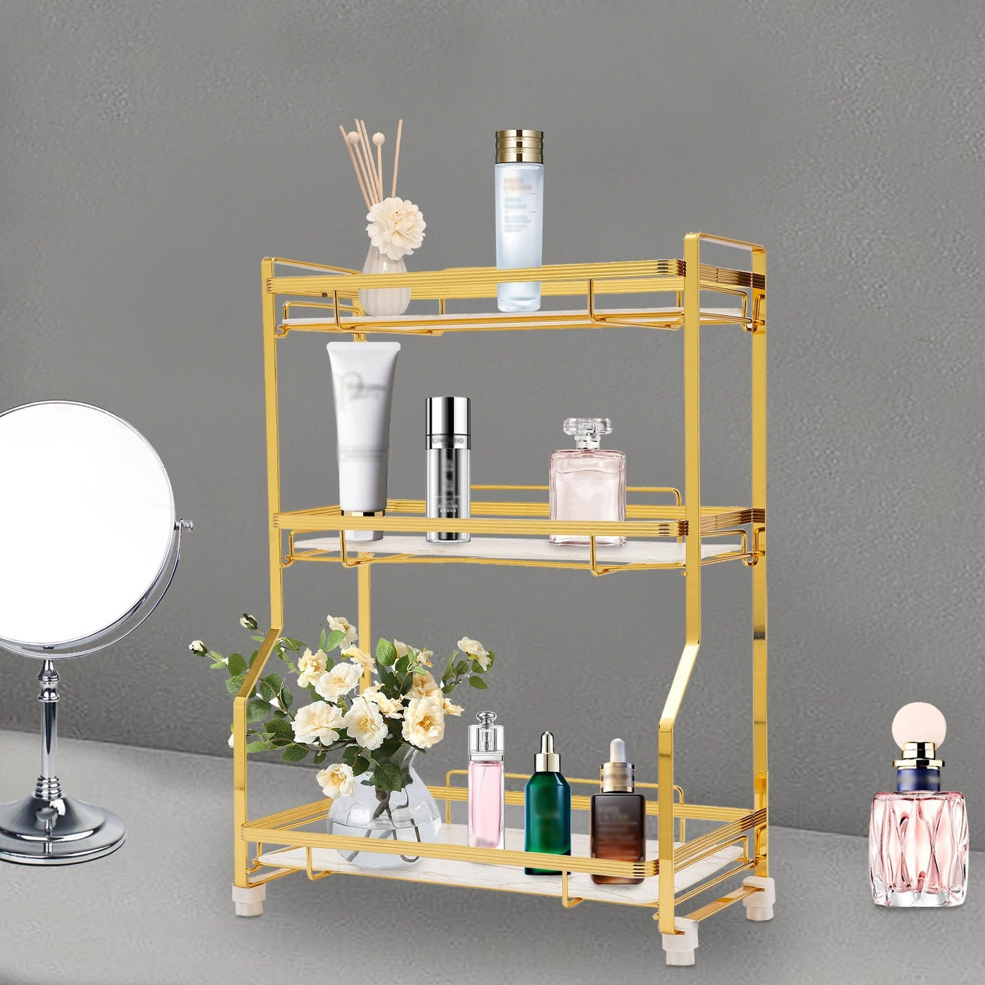 With its gold-toned shelves and marble decorative panels, this organizer combines luxury with functionality. Its modern minimalist design makes it not only a practical storage solution but also a decorative accent that enhances your vanity or bathroom décor.