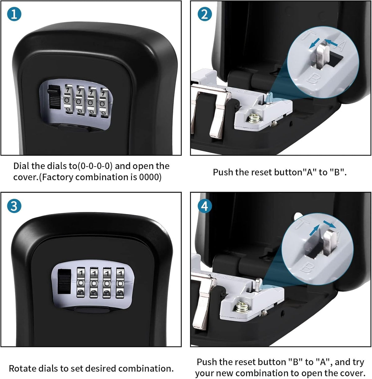 Secure and Convenie :The key lock box outdoor is equipped with a 4-digit resettable combination lock, providing keyless convenience and allowing you to set and reset your own personalized code. This effectively prevents key theft or unauthorized access, ensuring safety.