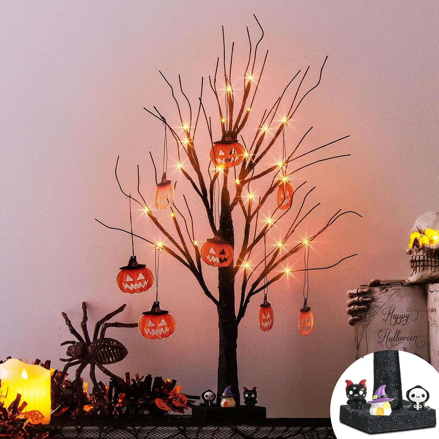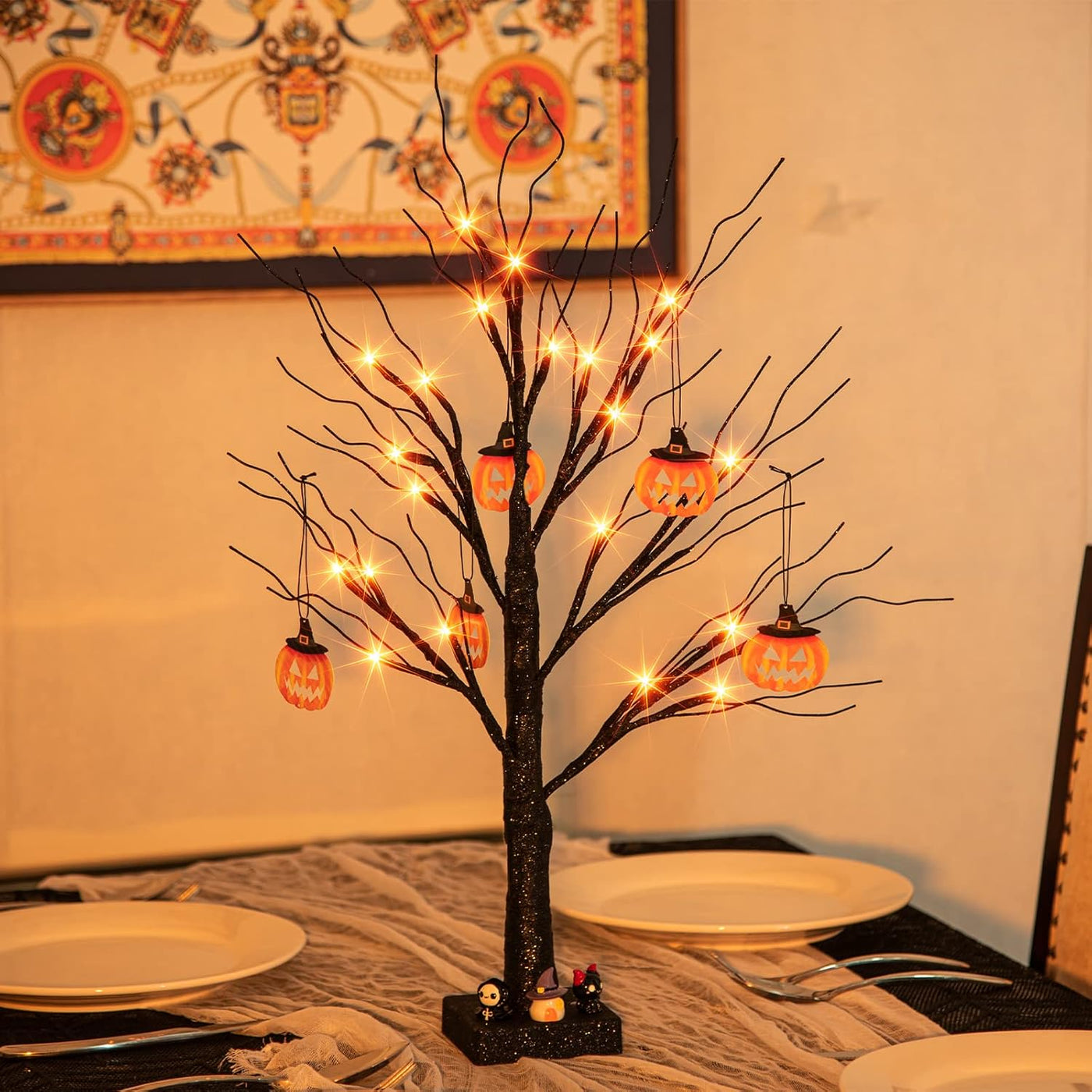 Small Black Glitter Halloween Tree with 24 Orange LED Lights 60cm