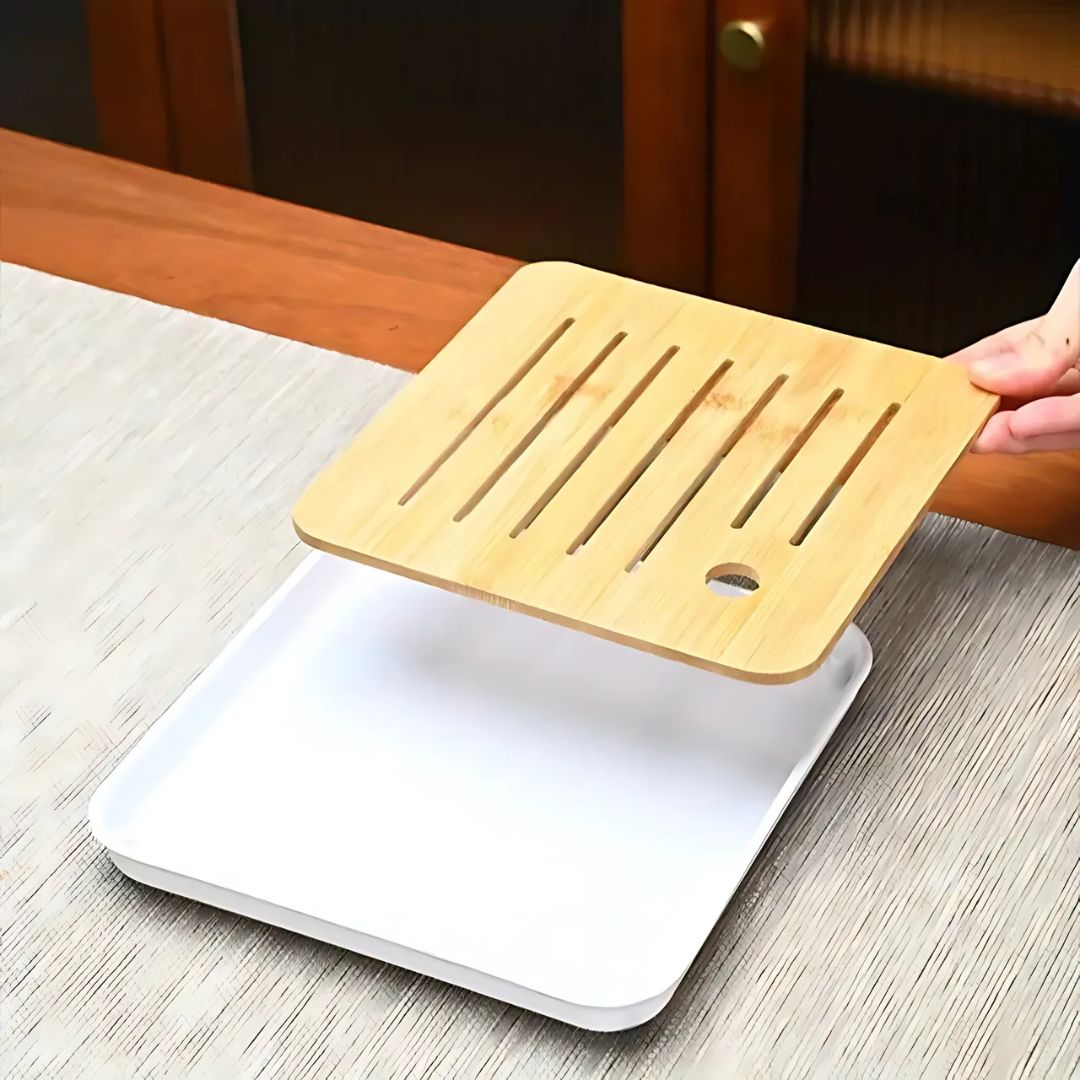 The included bamboo tray adds a natural aesthetic while providing a stable, organized surface for serving and preparation.
