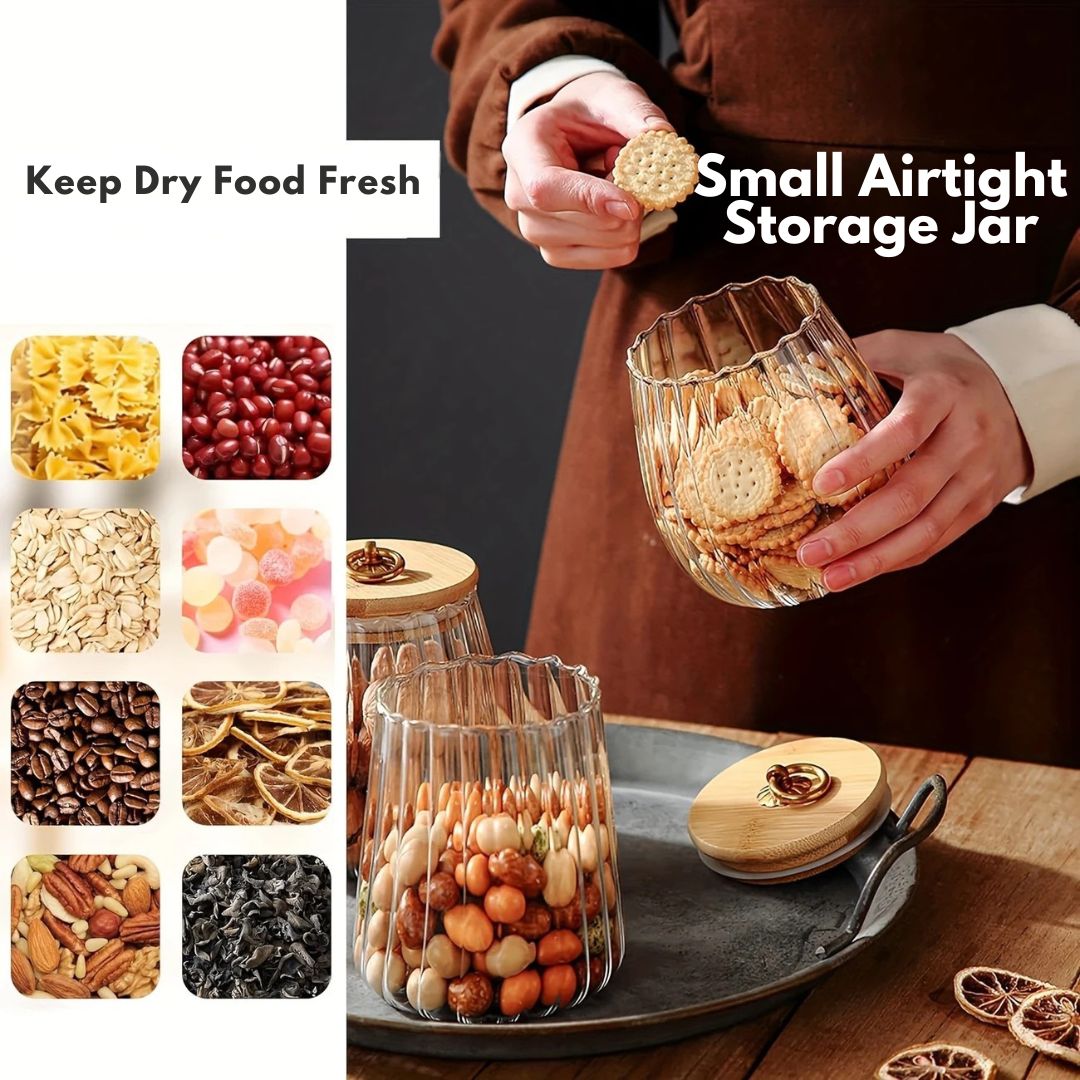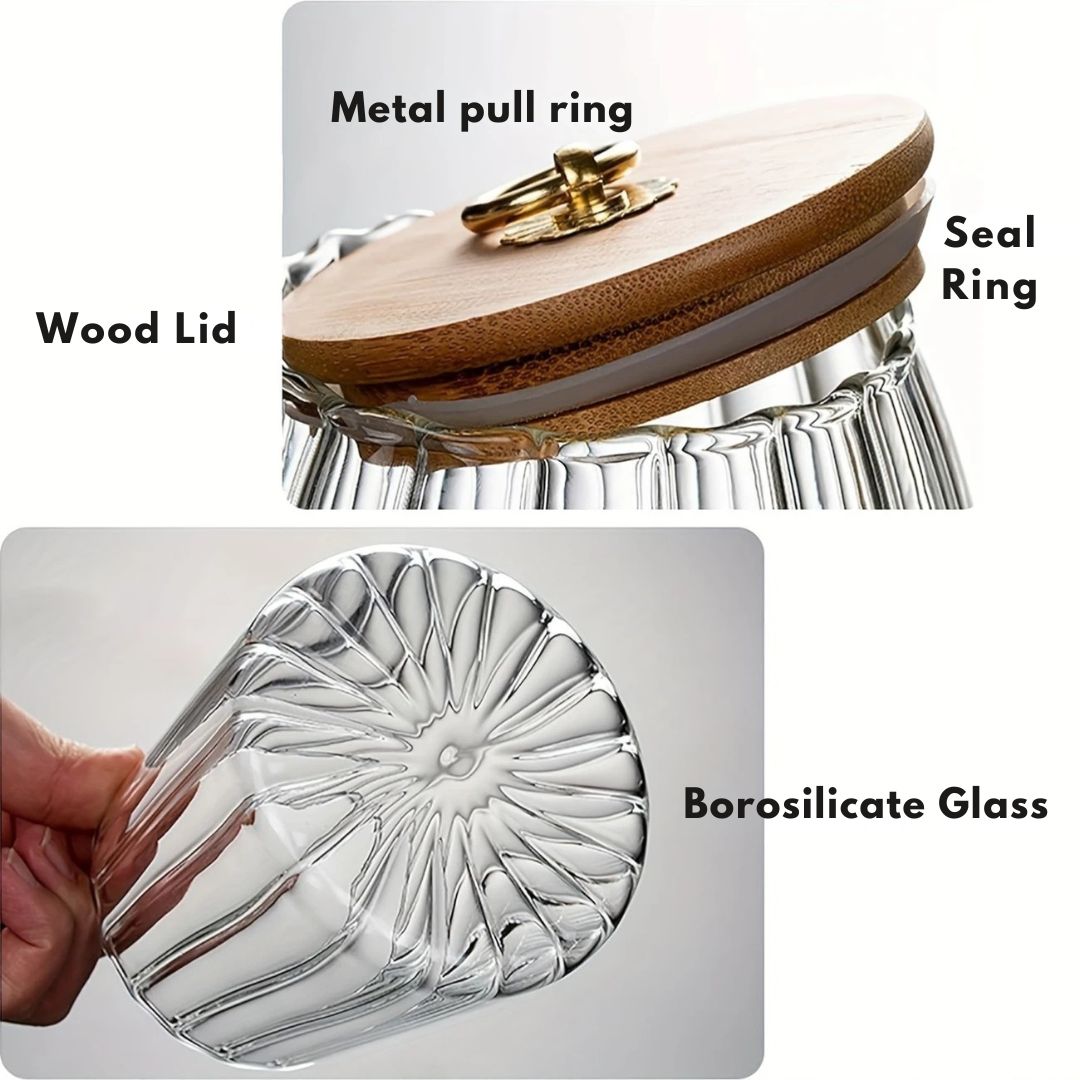 Sealed Wooden Lid with Gold Handle – Lock in Freshness Each jar features a natural wooden lid with an airtight seal, ensuring your contents stay fresh and protected from moisture. The elegant gold handle adds a touch of sophistication while making it easy to open and close — merging style and functionality seamlessly.