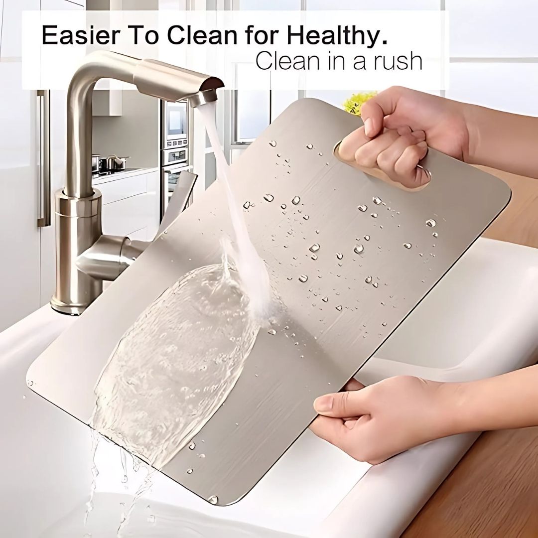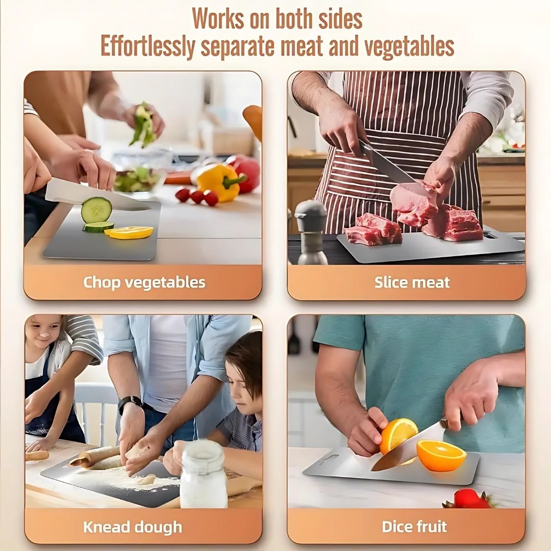 The Titanium Cutting Board is built to last, crafted from ultra-resilient titanium that resists wear, dents, and warping. Its sleek, metallic surface adds a modern, professional look to your kitchen while withstanding even the most rigorous chopping, slicing, and kneading tasks. Whether you're meal prepping daily or entertaining guests, this board keeps up effortlessly and stylishly.